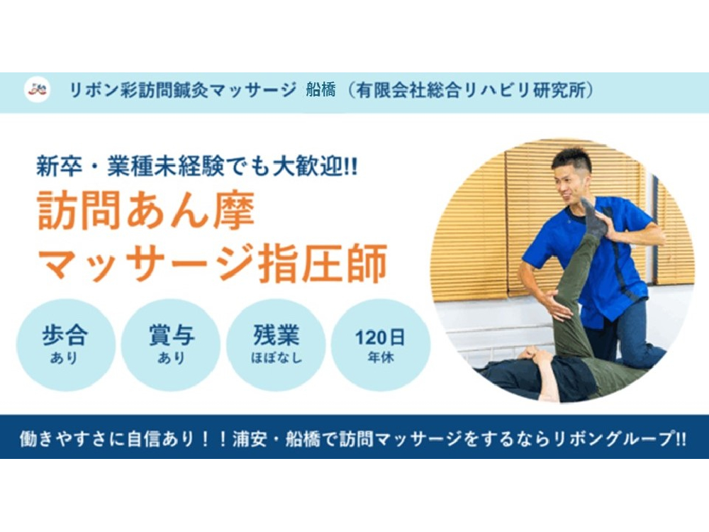 新卒者歓迎臨床経験不問独立支援制度有資格取得支援制度有勤務時間応相談社会保険完備交通費支給有給休暇有制服貸与待遇・福利厚生リボン彩訪問鍼灸マッサージ船橋(有限会社総合リハビリ研究所)