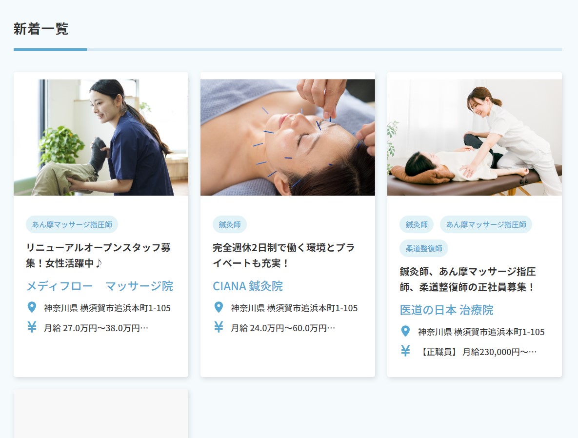 「鍼灸師 求人」「マッサージ師 求人」「柔道整復師 求人」という主要3ワードでいずれも検索上位表示をキープし続けている求人サイトです。